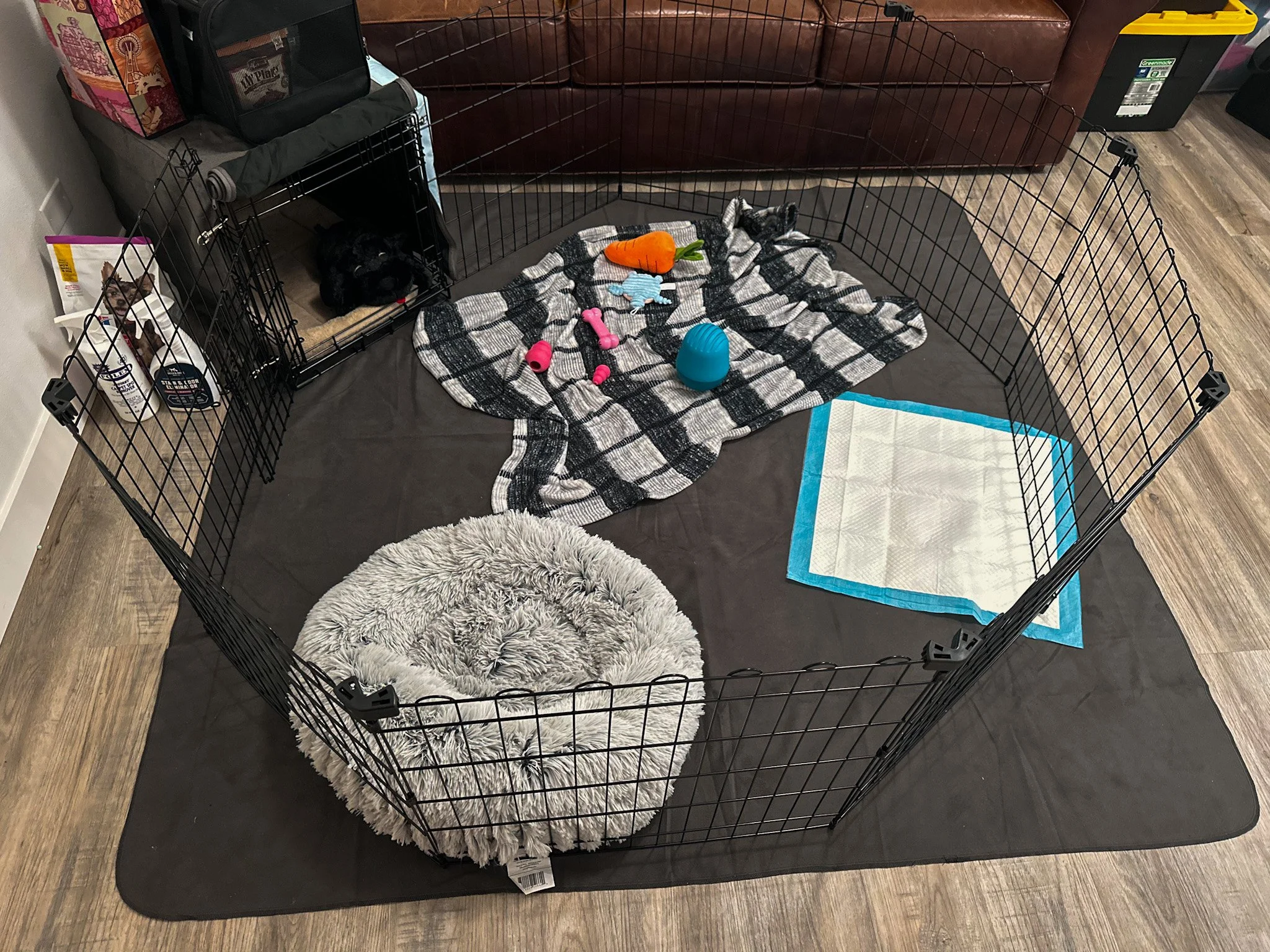 Playpen setup. I recommend a playpen attached to their crate where they can sleep and play safely. Include a bed, water, food, and toys. It also gives them access to a pee pad if you choose to use one, just like the picture this fluffy dog bed is great to have a nice spot to lay, I do not recommend these inside the crate as they do not wash as well as these crate beds do or something similar. The Washable water proof pee pad is wonderful if you are worried about the floor beneath your play area, I have these and they wash in the washer and come out like new!